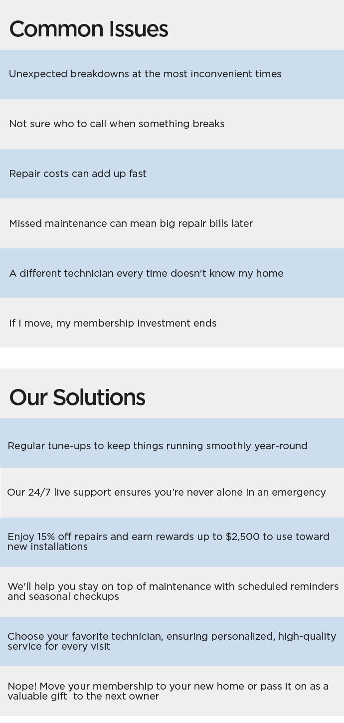 Unexpected breakdowns, rising costs, and the hassle of managing multiple service providers can leave you feeling overwhelmed. Comfort360 takes the stress out of home maintenance by providing comprehensive coverage for your HVAC, plumbing, and electrical systems. With proactive maintenance, exclusive discounts, and 24/7 support, we help you stay ahead of costly repairs and ensure your home stays comfortable year-round. Say goodbye to surprises and hello to peace of mind with Comfort360.